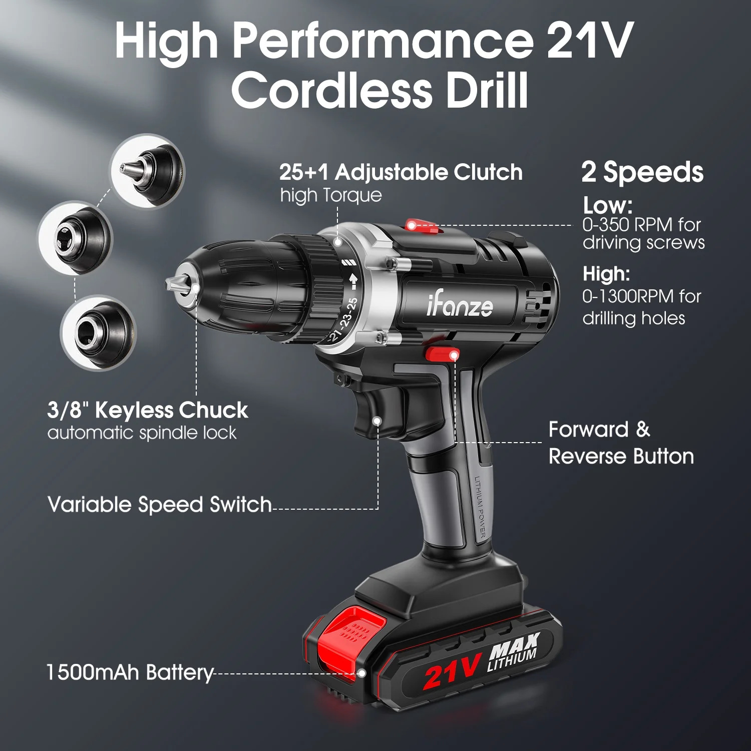 - Powerful Performance: 21V cordless drill delivers high torque with 2 variable speeds (0-350 & 0-1350 RPM) for versatile use on wood, metal, plastic, and more.
